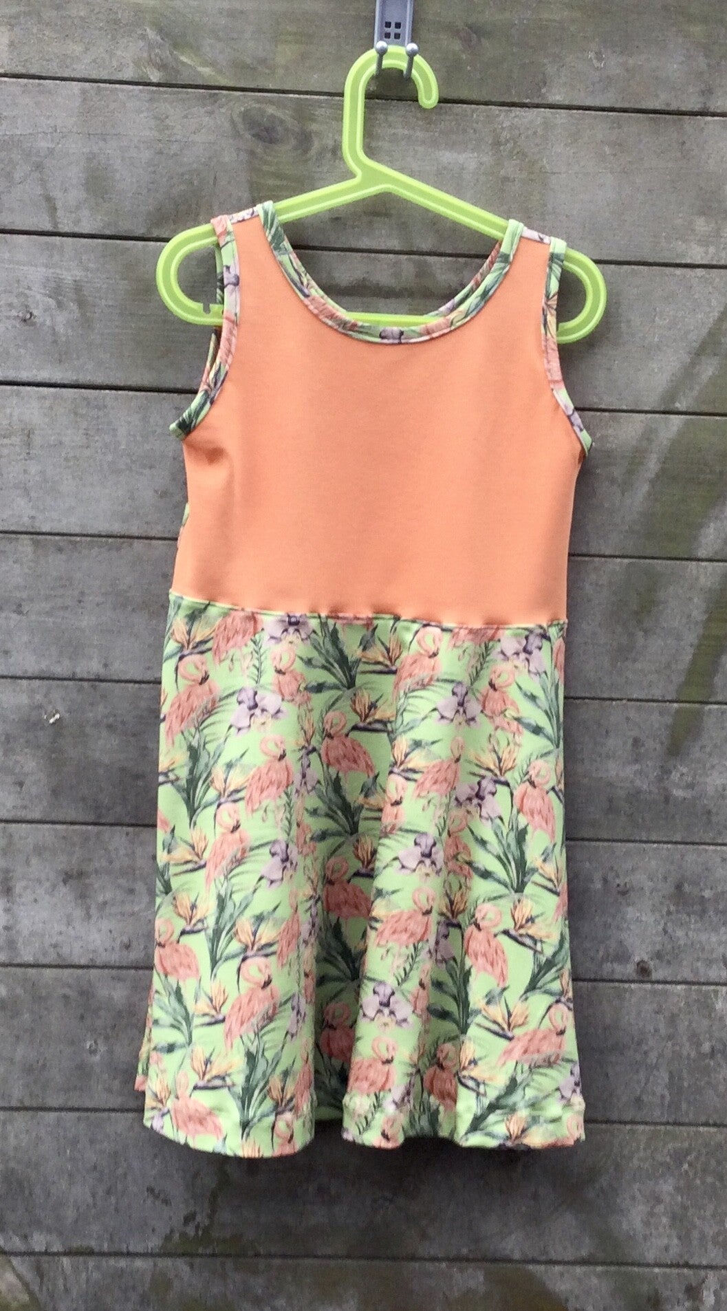 Hermine kleedje / 128 / Oranje en groen met flamingo's